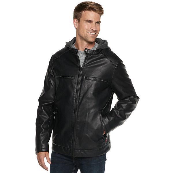 Mens Faux Leather Hooded Racer Jacket. Please Choose a Size. Complete your cold-weather look with this stylish mens hooded racer jacket from Levis.